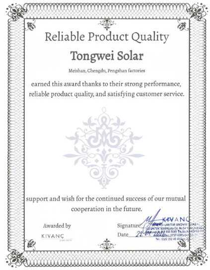 基于年度合作情况及综合评估结果,土耳其光伏企业ALFA Solar Enerji、CW Enerji、KIVANC Enerji、KALYON Gunes等公司近期对合作伙伴开展年度评价,通威太阳能凭借在产品质量稳定性、供货可靠性及服务协同能力方面的突出优势,成功获评 “卓越产品质量奖”“优秀供应商奖”等系列奖项,充分体现了通威太阳能在土耳其市场合作中的稳健表现。