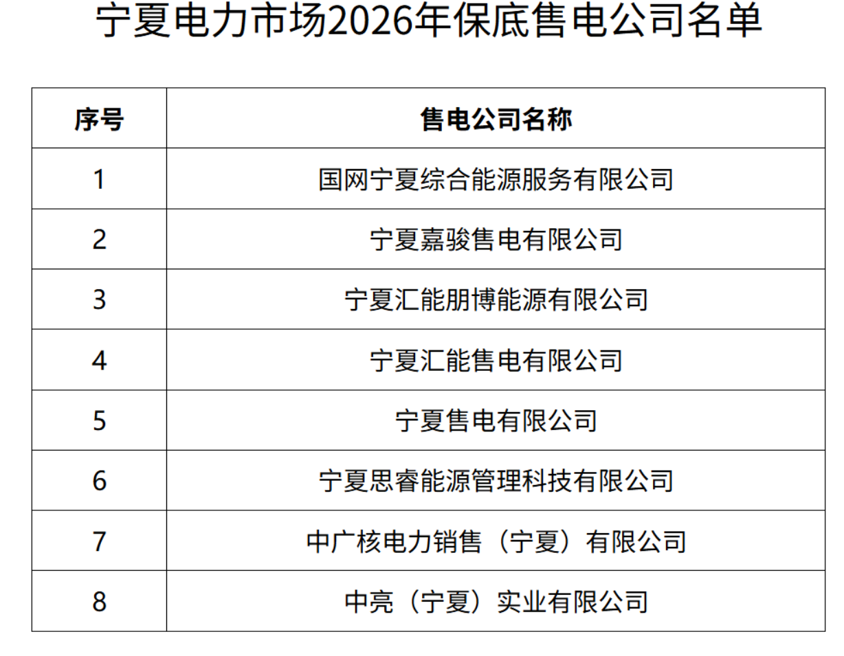 2月24日,宁夏自治区发改委发布2026年宁夏电力市场保底售电公司名单。