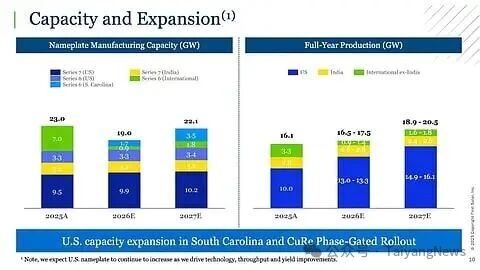 随着生产重心从东南亚向美国转移,First Solar 的名义年制造产能预计将在 2026 年下降至 19GW,随后于 2027 年回升。(图片来源:First Solar, Inc.)