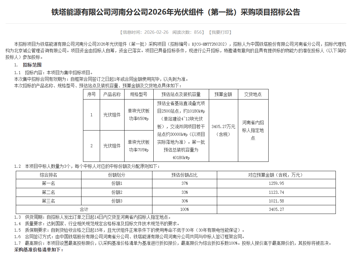 近日,铁塔能源有限公司河南分公司2026年光伏组件(第一批)采购项目招标公告。预估全省基站直流叠光项目2500站点,约10180kWp(单站建设4~12块光伏板),交流并网项目若干站点约30000kWp(以项目实际落地为准)。第一批预估总装机容量为40180kWp。
