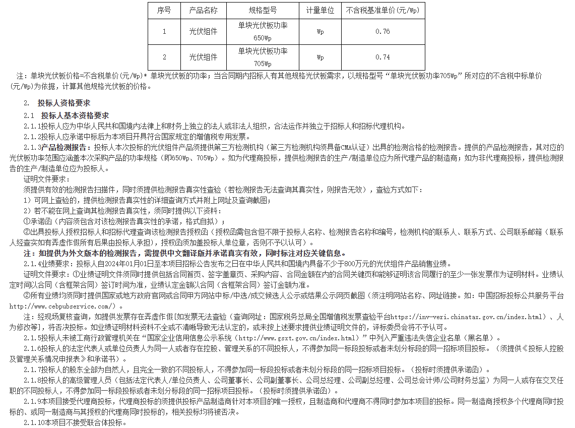 光伏组件招标型号为单块光伏板功率650Wp光伏组件,单块光伏板功率705Wp光伏组件。并设置投标最高限价,其中650Wp光伏组件不含税基准单价0.76元/W,705Wp光伏组件不含税基准单价0.74元/W。