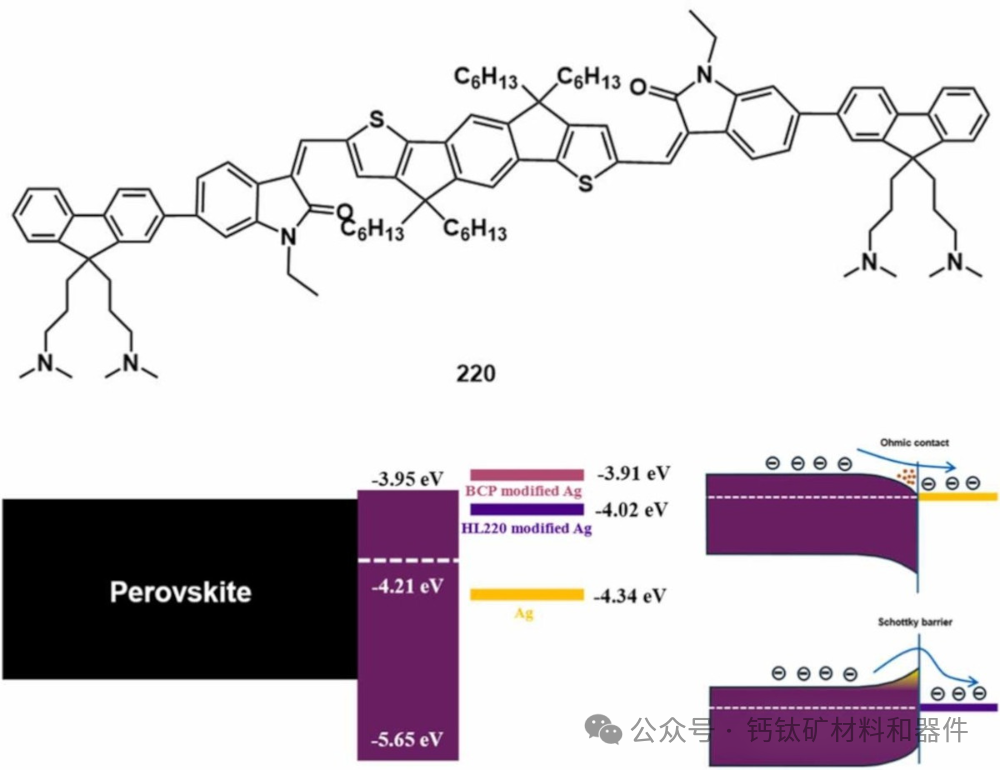 团队指出,HL220可与银电极发生化学反应,降低金属的工作函数。这种调整降低了PCBM与银电极之间的电子提取势垒,并改善了电荷传递特性。电学和形态学分析的综合结果表明,HL220有效抑制界面复合,并降低器件内串联电阻。