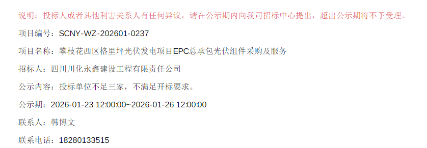 3月2日,攀枝花西区格里坪光伏发电项目EPC总承包光伏组件采购及服务终止公告,招标人为四川川化永鑫建设工程有限责任公司。公告显示,截止开标时间,无投标单位递交投标文件,不满足开标要求,故流标。