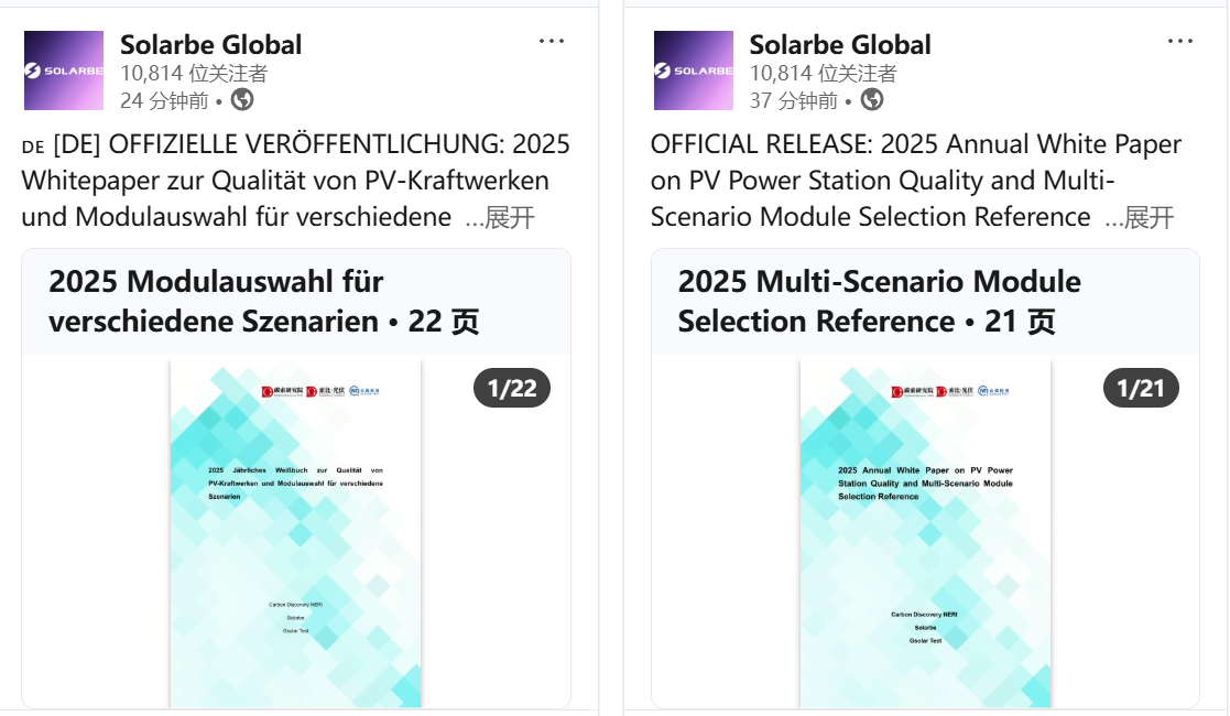 近日,索比光伏网联合碳索研究院、众森检测正式发布《2025年度光伏电站质量白皮书暨多场景组件选型参考》英文版及德文版。