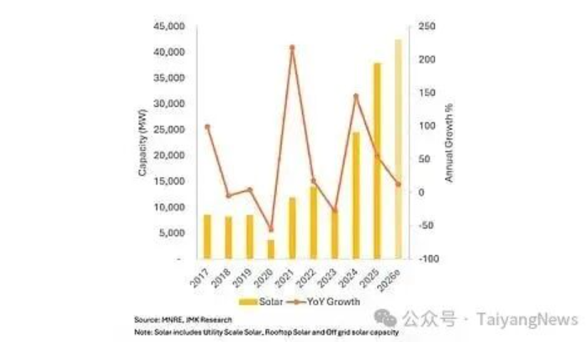 根据 JMK Research & Analytics 的最新预测,印度光伏新增装机容量将在 2026 年再创历史新高,预计达到 42.5GW。该国 2025 年光伏装机量约为 38GW。