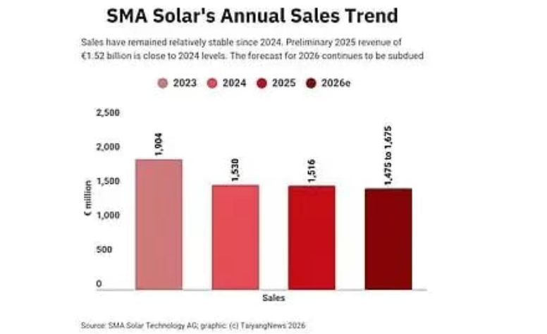 财报图表显示了 SMA Solar 的年度销售表现,包括 2025 年初步业绩及 2026 年销售指导范围。(图片来源:TaiyangNews)