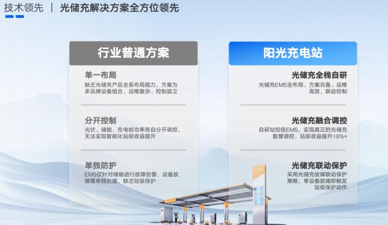 阳光新能源实现光储充全栈自研,从光伏、储能到充电设备及 EMS 能量管理系统均自主研发,打破行业普遍采用外购组件的模式。对比行业普通方案,阳光光储充方案具备三大优势: