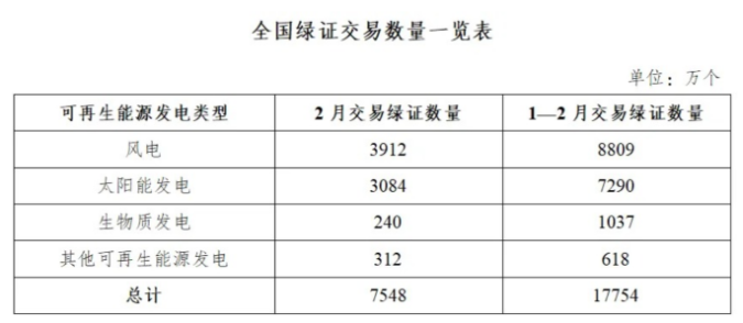 2026年2月,全国交易绿证7548万个,其中绿色电力交易绿证2996万个。