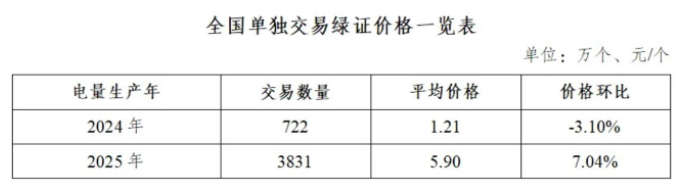 2026年2月,全国单独交易绿证4552万个,其中电量生产年为2024年的绿证交易722万个,平均价格1.21元/个;电量生产年为2025年的绿证交易3831万个,平均价格5.90元/个。