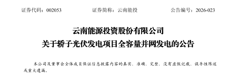 3月16日,云南能投发布公告,全资子公司会泽云能清洁能源有限公司投资建设的轿子光伏发电项目于2026年3月14日实现全容量并网发电。至此,公司已投产发电的新能源(包括风电和光伏)总装机容量达到264.486万千瓦,其中风电241.886万千瓦,光伏22.6万千瓦。