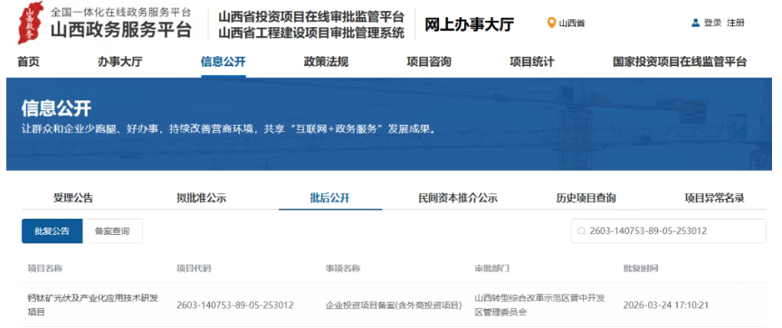 据山西政务服务平台发布信息,光语能源钙钛矿光伏及产业化应用技术研发项目于3月24日完成备案审批。