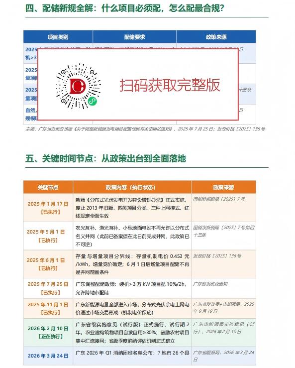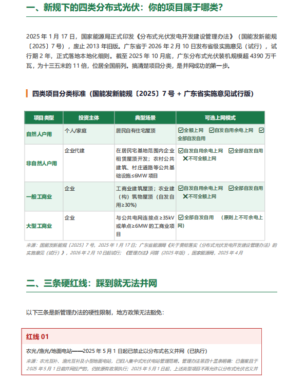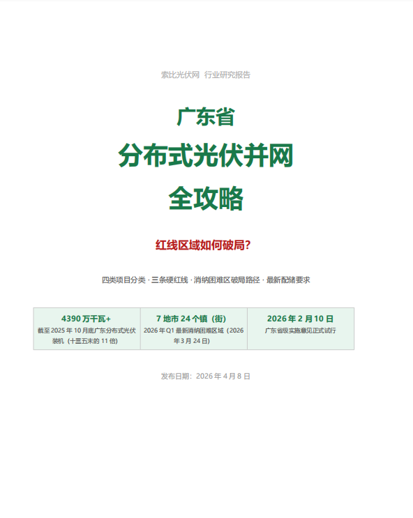 索比光伏网结合最新的国家管理办法(国能发新能规〔2025〕7号)和2026年2月10日正式试行的广东省级实施意见,整理了四类项目分类标准、三条硬红线详解、7地市消纳困难区现状与四条破局路径,以及从2025年1月到2026年3月全部关键政策节点速查。