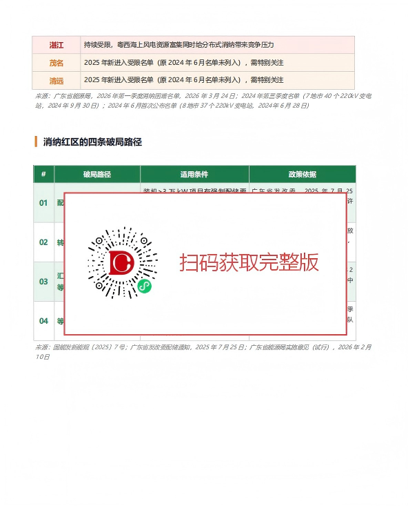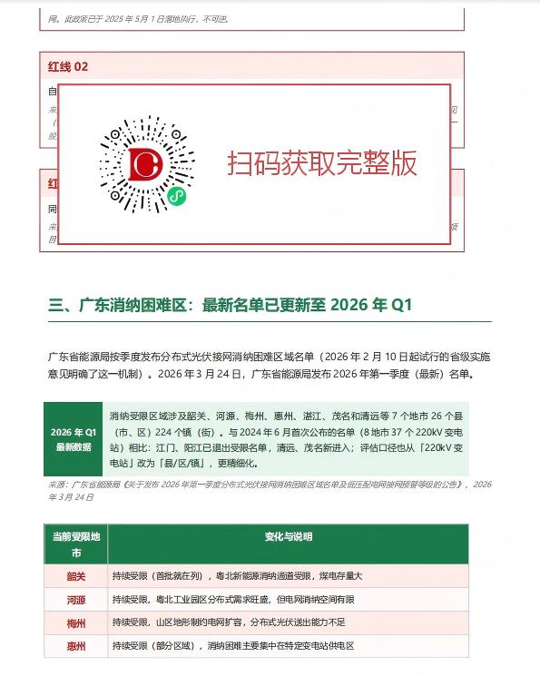 第二,你的项目所在区域能不能并?2026年3月24日,广东省能源局刚刚公布了2026年第一季度消纳困难名单——7个地市26个县(市、区)224个镇(街)受限。而且这份名单是动态更新的,茂名和清远是新进入的,江门和阳江则已退出,你需要查最新一期,而不是一年前的数据。