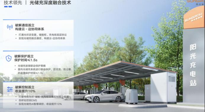 不同于市面上多品牌设备拼凑的充电站方案,阳光新能源的阳光充电站实现了光储充全栈自研,从光伏逆变器、储能系统到充电桩、站控级EMS,均采用统一技术体系。这种一体化设计避免了不同品牌设备之间的通信壁垒,确保光伏、储能、充电桩之间协同高效,运维更加简便,故障率大幅降低。