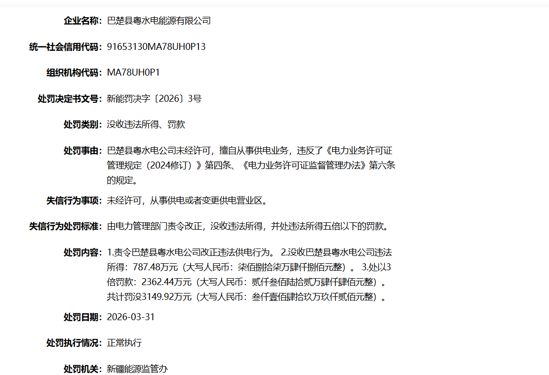 3月31日,国家能源局资质和信用信息系统处罚网站显示,巴楚县粤水电能源有限公司、阿瓦提县粤水电能源有限公司合计被罚3685万元,主要原因系未经许可,从事供电或者变更供电营业区。