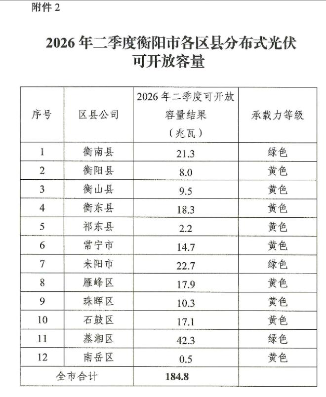 湖南衡阳市2026年Q2分布式光伏可开放容量公布