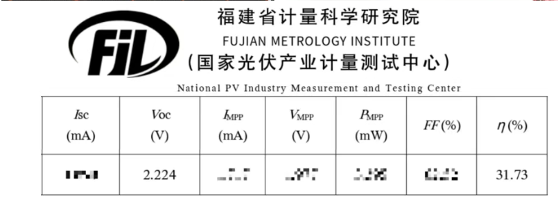 近日,华柔光电技术团队研发的全钙钛矿叠层电池经国家光伏产业计量测试中心(NPVM)认证,光电转换效率达到31.73%,单电池开路电压达到2.224V。这是华柔光电团队继上一次打破单结钙钛矿太阳能电池的实验室记录之后又一核心成果,再次彰显了公司在钙钛矿电池核心材料开发与器件制备领域的技术实力,标志着华柔光电全面迈入全球钙钛矿光伏技术领先行列。