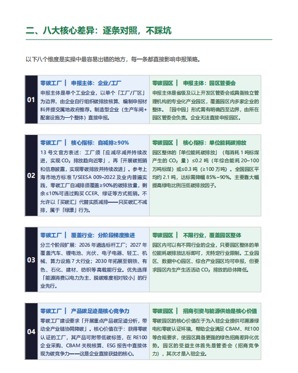 混淆最高发的场景是:制造企业以为申了零碳园区就等于做了零碳工厂;园区管委会把工厂认证指标当成园区建设目标来对标——方向一旦走偏,两三年的建设周期和数千万投入可能全部白费。