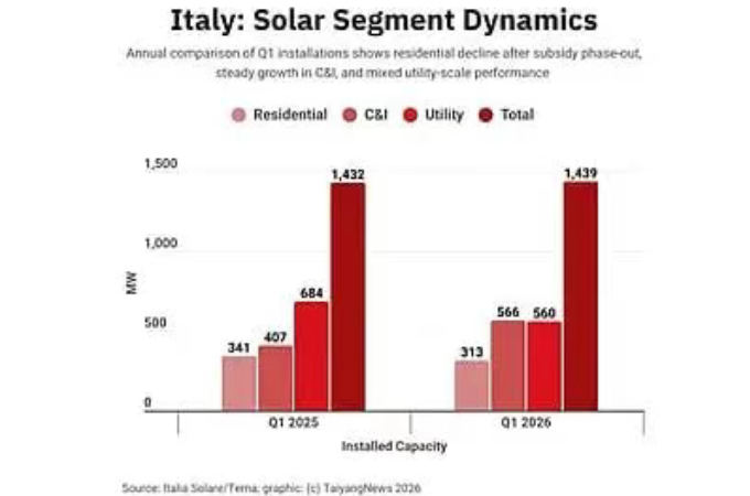 上图显示了 2025 年和 2026 年一季度意大利各细分领域光伏装机情况。(图片来源:TaiyangNews)