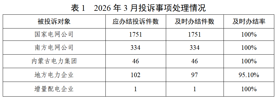 根据《12398能源监管热线投诉处理办法》和《12398能源监管热线举报处理办法》规定,现将2026年3月12398能源监管热线(以下简称“热线”)投诉举报处理情况通报如下。