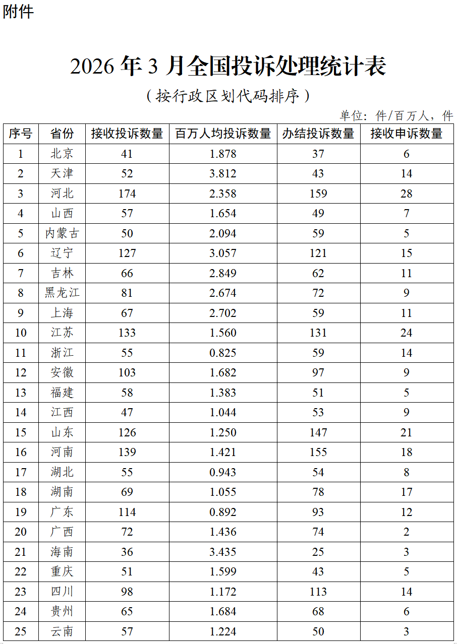 附件:2026年3月全国投诉处理统计表