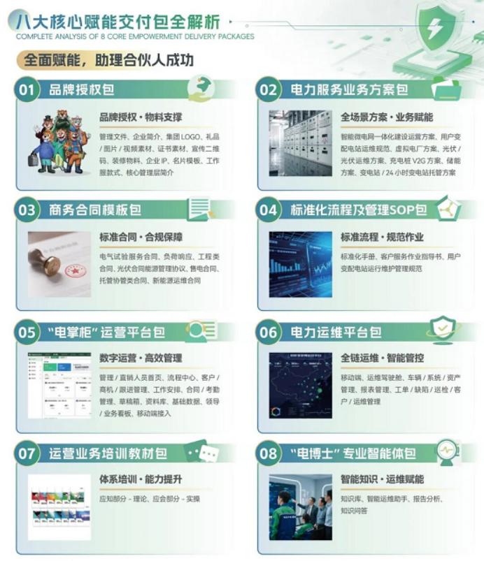 电力服务需求多元,方案能力决定业务边界。电管家集团为合伙人打造全场景业务方案库,覆盖智能微电网一体化建设运营方案、用户变配电站运维规范、虚拟电厂方案、光伏 / 光伏运维方案、充电桩 V2G 方案、储能方案、变电站 / 24 小时变电站托管方案等全品类电力服务场景。从传统运维到新能源运维项目,从工商业用户用电服务到新型电力系统业务,合伙人可直接调用成熟方案,精准匹配客户需求,快速响应市场机会,实现业务多元化拓展,持续创收增效。