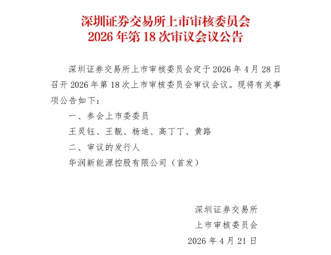 4月21日,深圳证券交易所上市审核委员会发布2026年第18次上市审核委员会审议会议公告,明确将于4月28日召开审议会议,审议华润新能源控股有限公司(以下简称“华润新能源”)的首发申请。华润新能源首发拟募集资金约为245亿元。