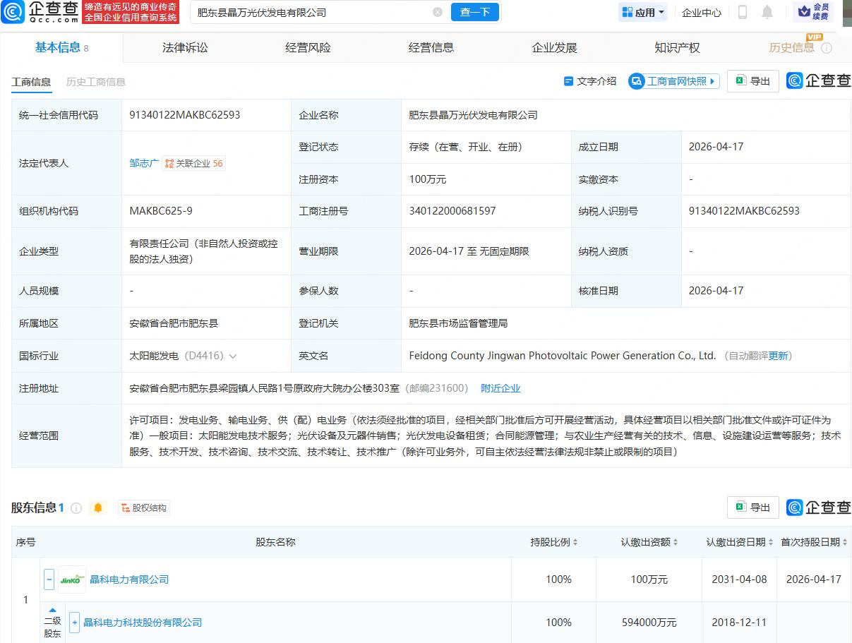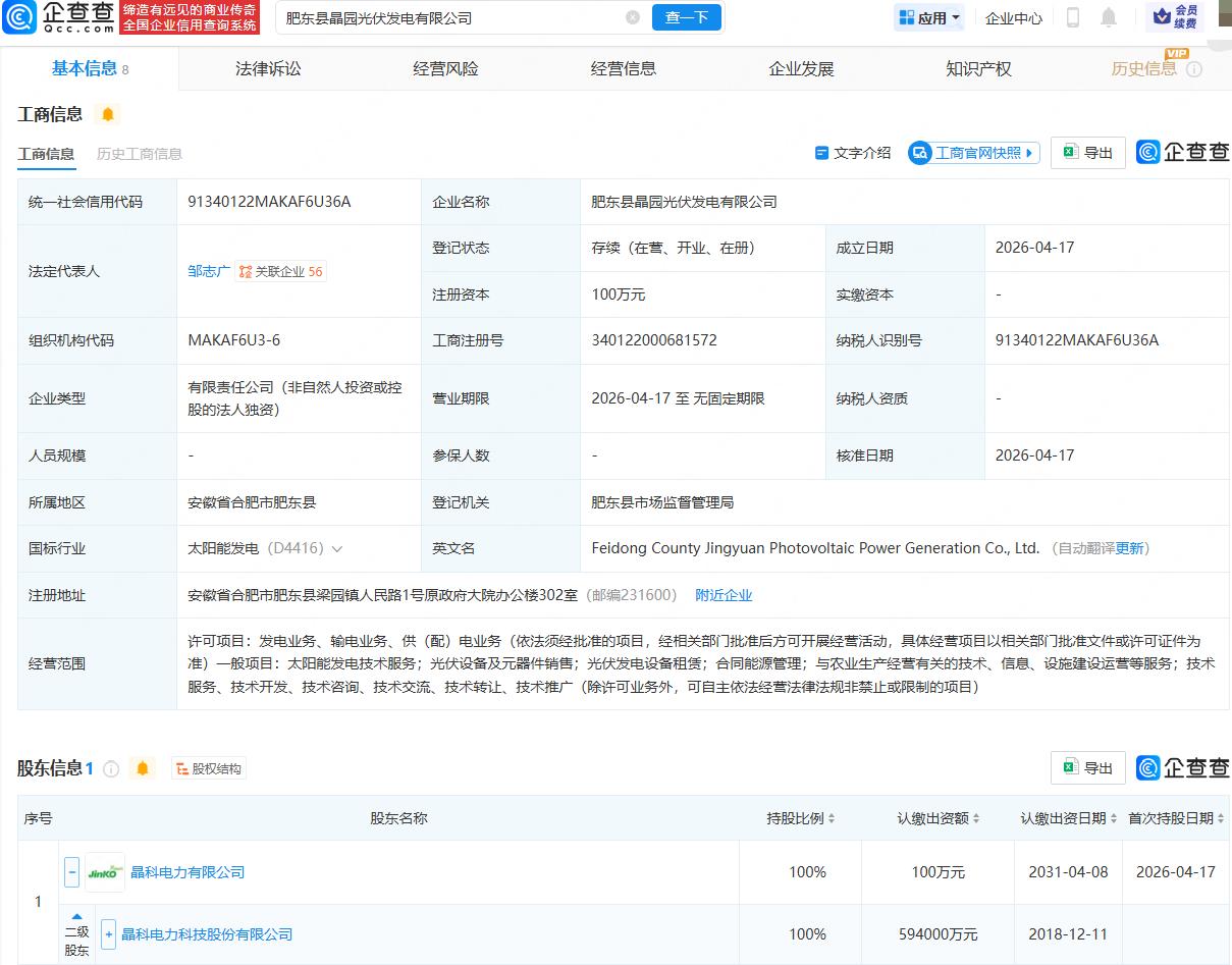企查查APP显示,近日,肥东县晶园光伏发电有限公司、肥东县晶万光伏发电有限公司成立,法定代表人均为邹志广,经营范围均包含:发电业务、输电业务、供(配)电业务;太阳能发电技术服务;光伏设备及元器件销售等。企查查股权穿透显示,两公司均由晶科科技(601778)间接全资持股。