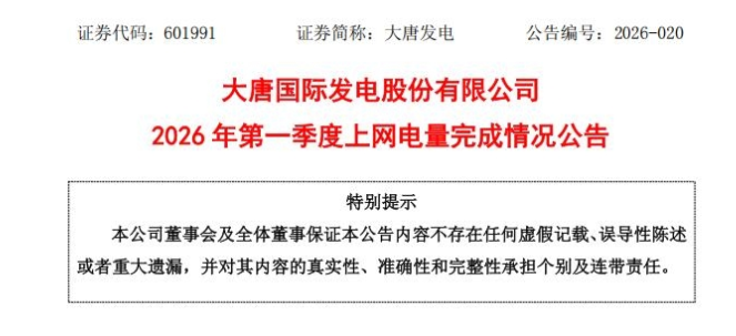 4月23日,大唐发电发布2026 年第一季度上网电量完成情况公告。