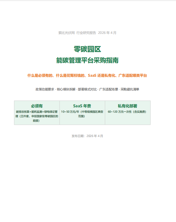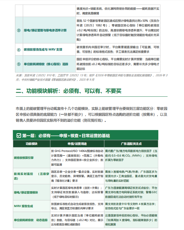 索比光伏网系统梳理三份政策文件的功能要求,将市场上的平台功能拆分为三层:必须有的5个核心模块(碳排放核算、三级能耗监控、绿电渗透率、MRV报告、单位能耗碳排放追踪)、按园区特点按需选购的5个进阶功能、以及销售爱讲但大多数广东园区用不上的4个溢价功能——包括AI数字孪生、区块链存证都在其中。