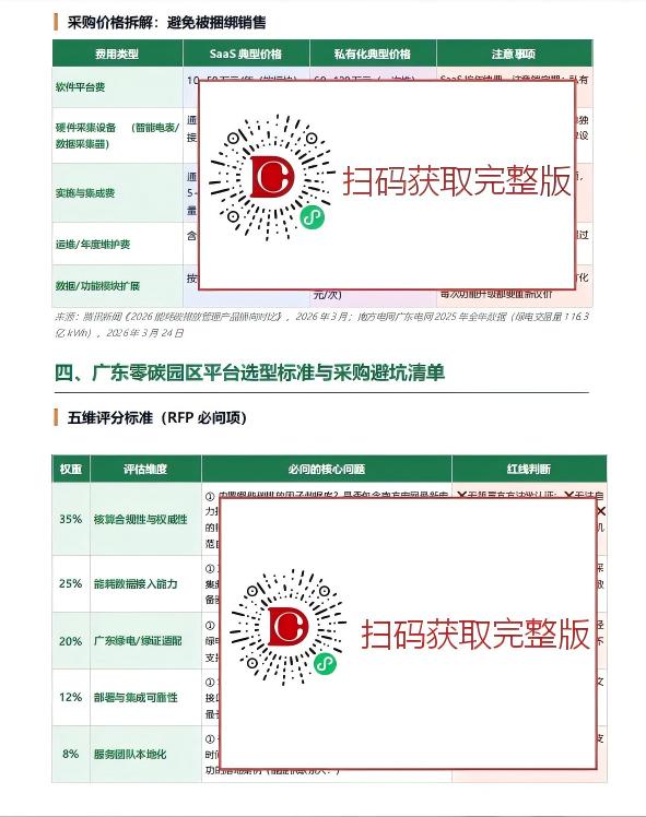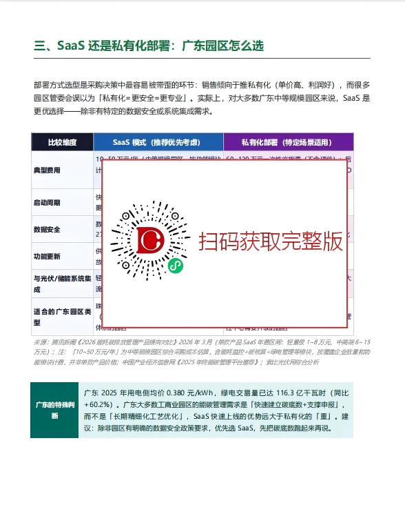部署方式上,SaaS还是私有化是最容易被销售带偏的决策:SaaS年费10~50万元、快速上线;私有化一次性60~120万元、启动周期4~9个月。对于大多数广东中等规模工商业园区来说,「快速建立碳底数+支撑申报」是首要目标,SaaS的优势远大于私有化的「重」。